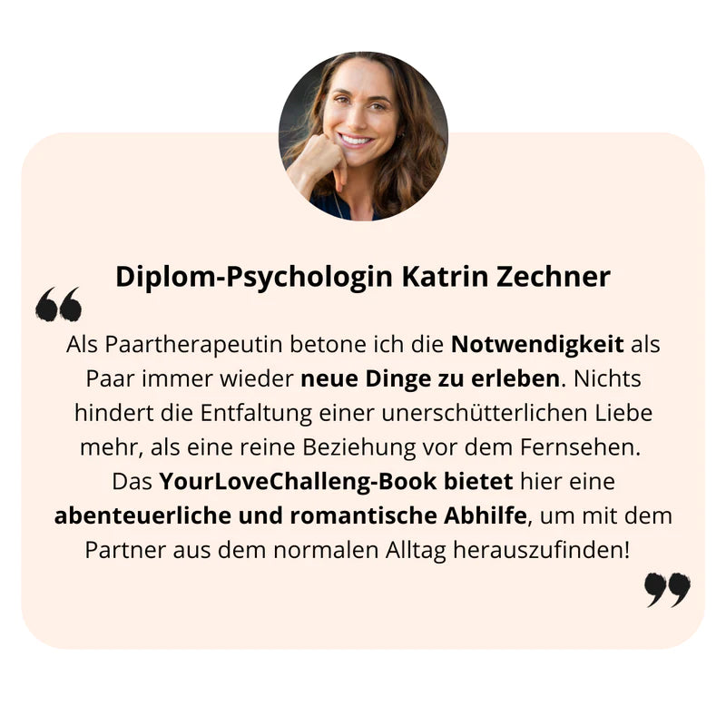 Willkommen bei YourLoveChallenge! Evelin und Daniel, die Gründer, bieten euch unvergessliche Momente zu erleben – das Geheimrezept für bereichernde zwischenmenschliche Beziehungen. Unsere Bücher bieten eine Vielzahl von Challenges für Paare, Freunde, Familien & Reisende, um jede Beziehung zu stärken und neues zu erleben. Entdeckt gemeinsam neue Facetten & gestaltet euer Erinnerungsbuch💖
