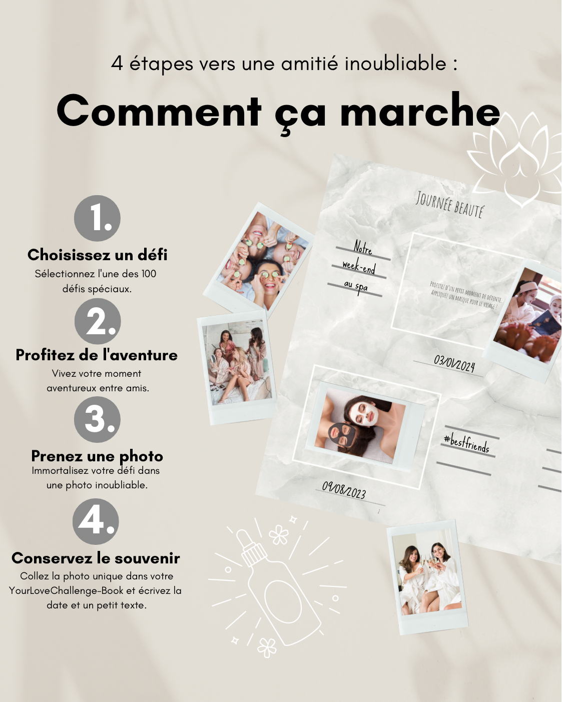 Bienvenue chez YourLoveChallenge ! Evelin et Daniel, les fondateurs, vous offrent des défis surprenants et des souvenirs inoubliables – la recette secrète pour l'amitié que tout le monde désire. Nos livres de défis regorgent d'idées variées pour enrichir votre amitié et encourager des expériences communes. Découvrez ensemble de nouvelles facettes et créez votre livre de souvenirs 💖