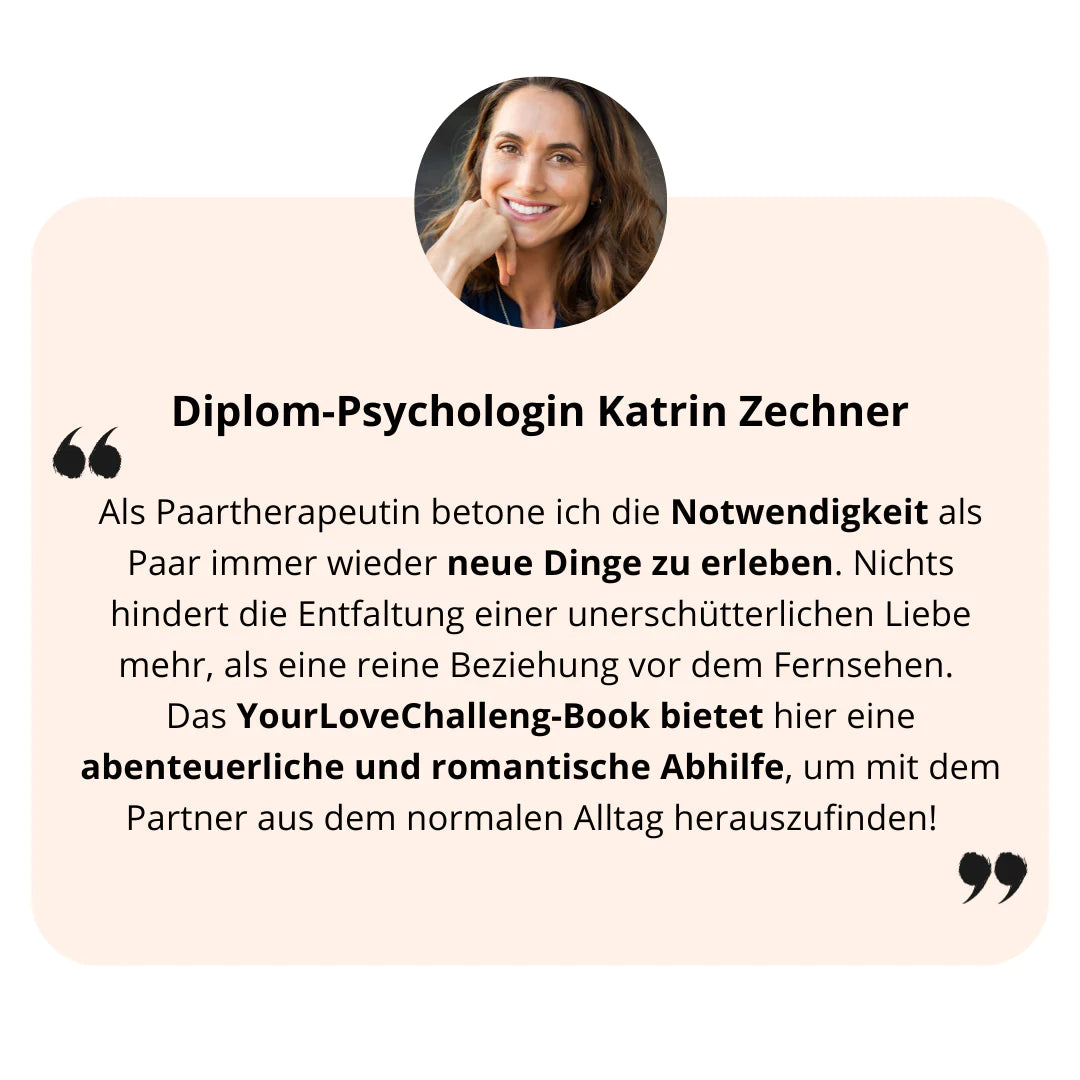 "YourLoveChallenge hat unsere Beziehung belebt und uns mit Spaß, Ideen und Nähe bereichert. Ein absolutes Muss für jedes Paar, danke!"