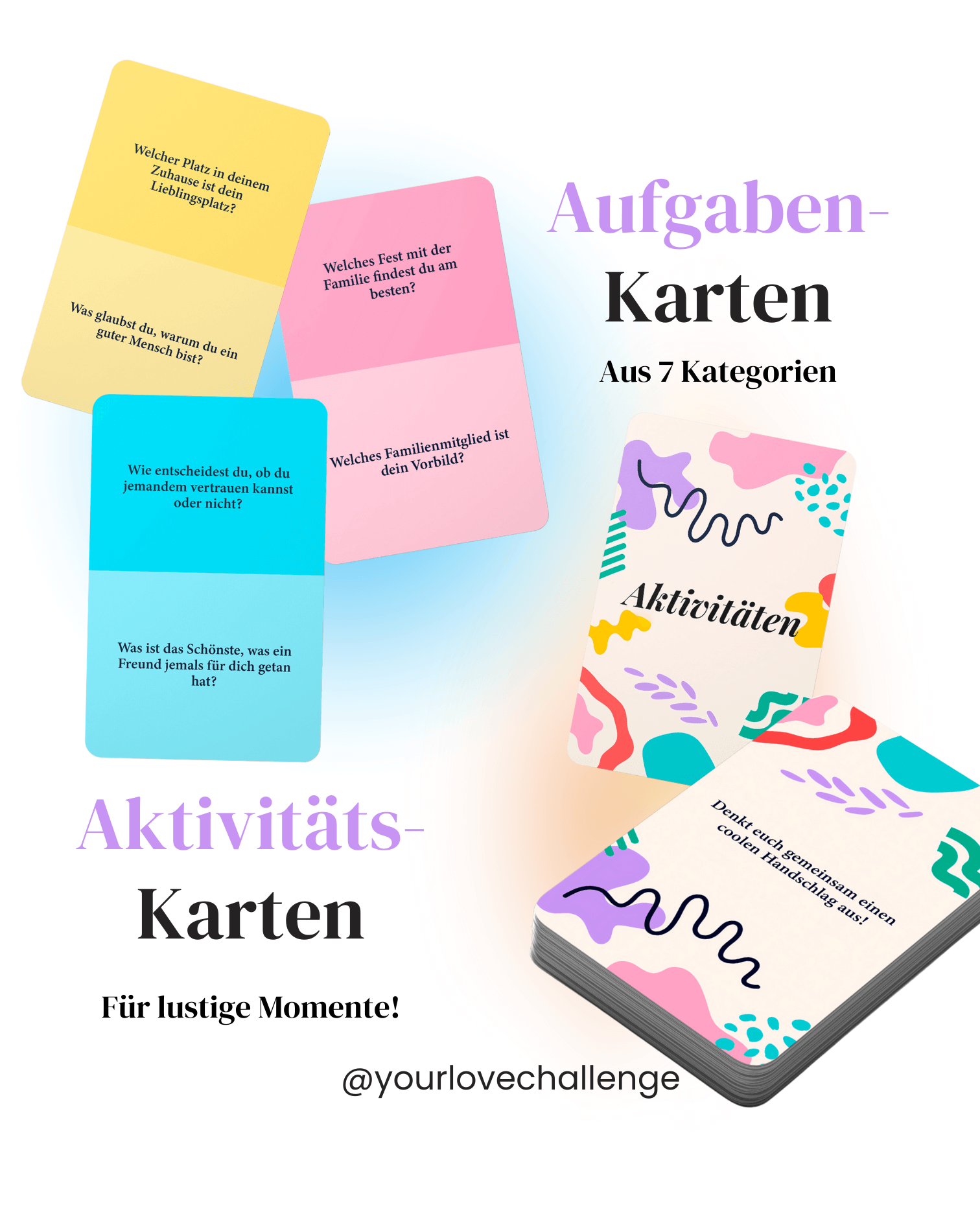 Willkommen bei YourLoveChallenge! Evelin und Daniel präsentieren die Spielkarten, die speziell dafür gestaltet wurden, die Stimmung auf jeder Hochzeit auf ein Maximum zu bringen. Unsere Mission ist es, mit kreativen Challenges die Gäste einander näherzubringen und unvergessliche Momente zu schaffen, die für immer festgehalten werden. Ob als Geschenk vom Gast oder als persönliche Investition des Brautpaars, die Challenge Karten sind ein garantierter Hit für eine unvergessliche Hochzeit. Genießt die Zeit mit den engsten, denn diesen Tag gibt es nur EINMAL IM LEBEN! 💖