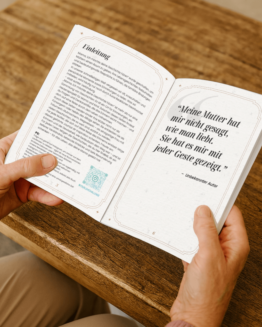 Beim Lesen von Mamas Erinnerungen entstehen Gespräche, Nähe und ein tieferes Verständnis füreinander. Jede Seite bewahrt ein Stück seiner Geschichte, das ihr zusammen neu entdecken könnt.