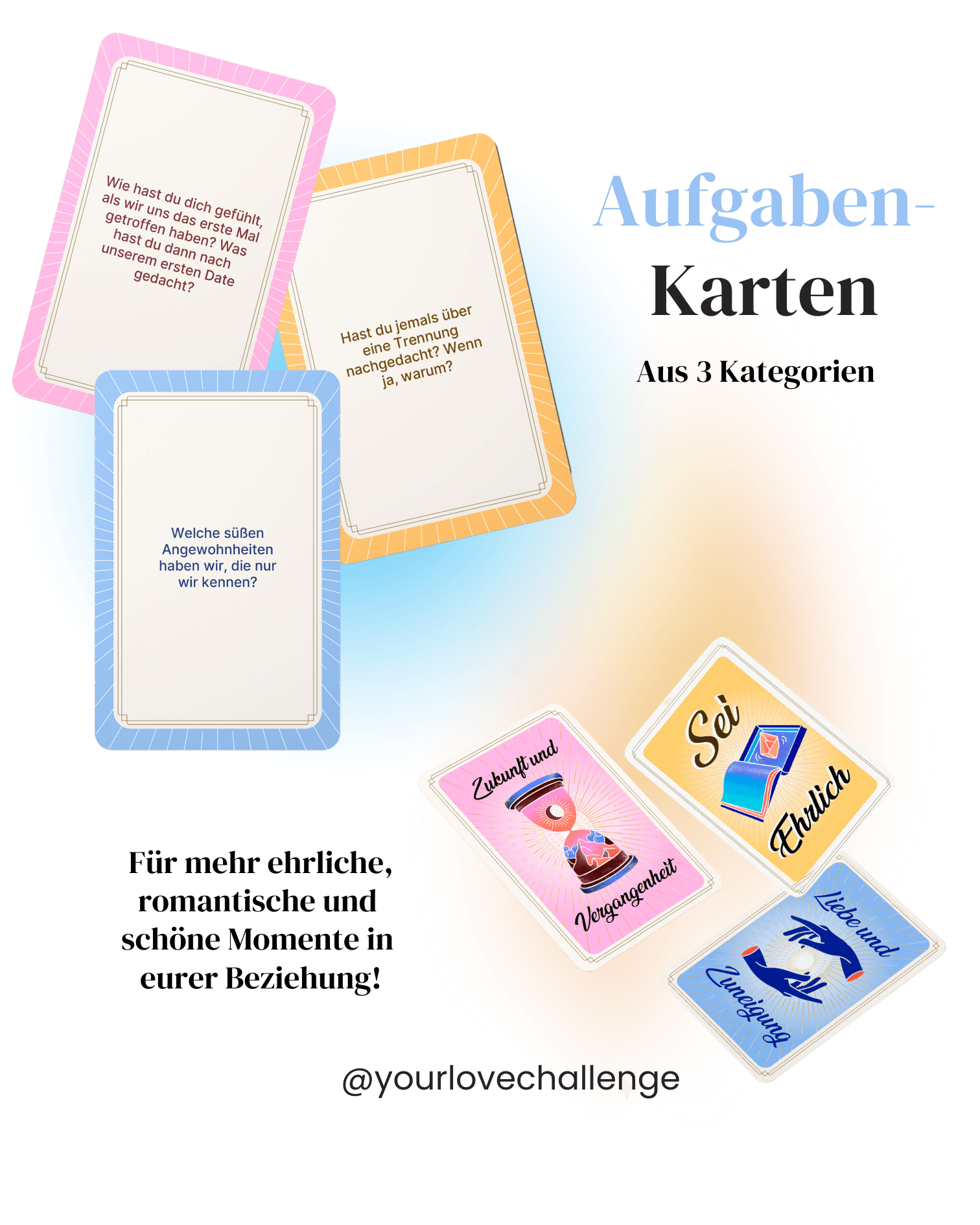- Abwechslungsreiche Aufgaben: Entdeckt neue Seiten an euch und bringt frischen Wind in eure Beziehung.