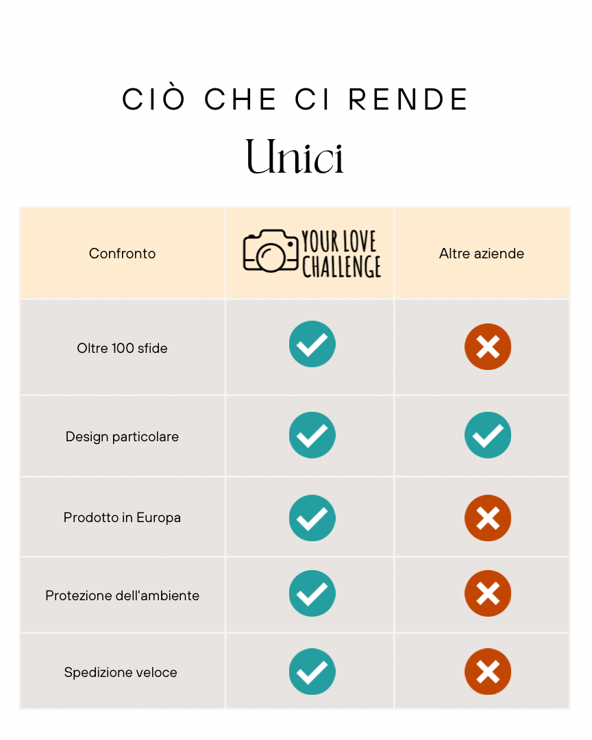 Dal momento della fondazione di YourLoveChallenge, la qualità e la soddisfazione sono la nostra priorità. I nostri prodotti non solo portano divertimento e avventura nelle relazioni, ma offrono anche una garanzia anti-noia.
